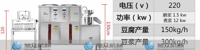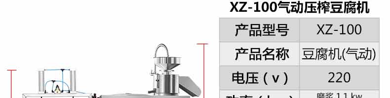 名称xz-61手动带搅拌花生豆腐机 电源220V 功率磨浆1.1KW,煮浆12KW 产量豆腐产量50KG/H,豆浆产量100KG/H 尺寸尺寸140*60*120mm 重量重量100KG 规格 其他
