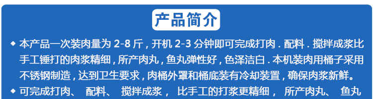 SZ-22型肉丸打浆机,本机装肉用桶子采用不锈钢制造,达到卫生要求,肉桶外罩和桶底装有冷却装置,确保肉浆新鲜。比手工的打浆更精细,所产肉丸、鱼丸弹性好,色泽洁白。